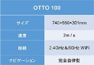 OTTO100は最大積載量100kgの小型搬送ロボット。62mmのリフトがカートやシェルフと連結・連動することで、作業環境に最適な利用が可能となる。LIDARにより障害物や人を回避して走行する。また、安全性を高めるための360度インジケータ照明(ターンシグナル、ブレーキライト、ステータスライト)と音声シグナルによって、周囲の作業者はOTTOの進行方向を確認できる。