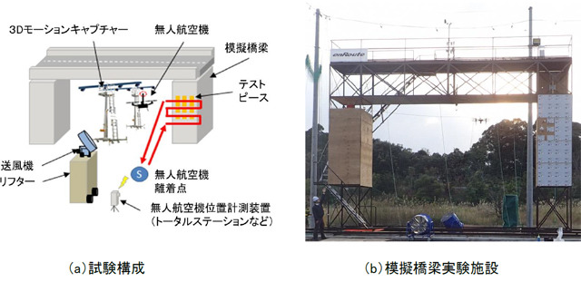 今回の飛行試験は、エンルートが開設したドローンフィールド東金の中に設置した模擬橋梁実験施設を用いて、2017年10月16日から順次実施された。ドローンによる高橋脚上部や床板の近接画像撮影、高橋脚の打音検査などの橋梁点検プロセスを再現するとともに、送風設備を用いて、安全な運用を阻害する風などの外乱を考慮した試験環境の妥当性の検証も行った。これにより、性能評価基準策定に必要となる各種データを取得することができたという。