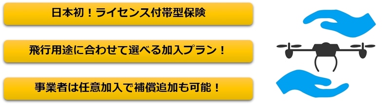 「ドローン操縦士回転翼3級」をはじめとするDPA認定ライセンス保有者が、業務以外でドローンを操縦中に発生した事故で同ライセンス保有者が負担する法律上の損害賠償責任を補償する保険、もしくは同ライセンス保有者がドローンを業務で操縦中に発生させた対人・対物事故について、そのライセンス保有者が所属する法人および個人事業主が負担する法律上の損害賠償責任を補償する保険。