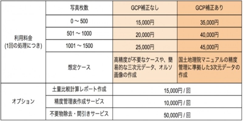そこで、それぞれのクライアントのニーズにあわせた「使ったぶんだけプラン」の提供を開始。この度の新料金プランの適用により、GCP補正込みでの自動点群生成が、1回あたり3.5万円と国内最安(※テラドローン調べ)の価格での提供可能となった。