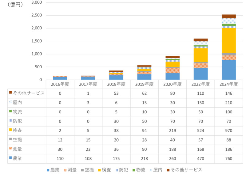 分野別に見ると、2017年度は機体市場が210億円(41.7%)と最も高く、サービス市場が155億円(30.8%)、周辺サービス市場が138億円(27.4%)と続いている。各市場とも今後も拡大が見込まれており、2024年度においては、サービス市場が2,530億円(2017年度の約16倍)と最も高くなり、機体市場が730億円(2017年度の約3.5倍)、周辺サービス市場が451億円(2017年度の約3.3倍)に達する見込みである。