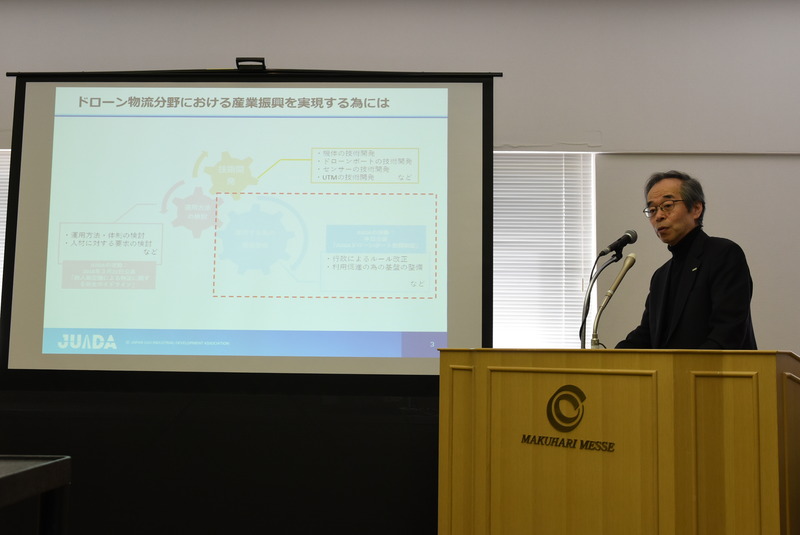 2015年秋に官民協議会で「3年以内にドローンを使った荷物配送を目指す」という政府指針が出ており、2018年は“レベル3”、つまり無人地帯での目視外飛行の利活用として、離島、山間部でのドローンによる物流の実現を目指している。そんなことからJUIDAとしては2018年を“物流ドローン元年”と提唱している。発表会の冒頭で鈴木真二JUIDA理事長は、「レベル3の飛行による物流ドローンの実現には、①技術的要素、②運用方法の検討、③環境整備という三つが必要」だと話す。このうち二つ目の運用方法の検討というのは、昨年12月にJUIDAが会員向けに発表した「無人航空機による物流に関するガイドライン」で、今回のドローンポート登録制度はこの三つ目の環境整備にあたる。