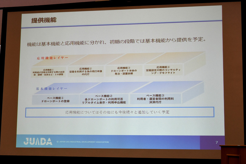また、ドローンポート登録制度が提供するのは基本機能と応用機能に分かれている。基本機能はドローンポートの登録と、その利用可否の状況を利用者側に提供すること、さらにポート利用の際の料金の決済代行であり、この部分はJUIDAが担うこととなっている。応用機能は、空路を設定する場合の警察や地域との調整、空路を利用するための申請代行、さらにドローンポート本体の設置、そしてコンサルティングとなっていて、こちらはブルーイノベーションが担う形になるという。