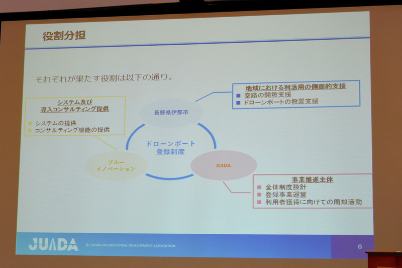 説明の中で鈴木理事長はドローンによる物流を行うためには“空の道”、つまり空路と“空の駅”ドローンポートが必要だと話す。すでにJUIDAでは昨年、ブルーイノベーションと長野県伊那市と共同で、ドローン物流の実証実験を三回実施。このときにドローンポートを設置したのは伊那市となっていたが、今後、こうしたドローンポートを設置して運営する自治体や企業、土地所有者に対して、整備のノウハウ提供と運営のサポートを行うのがドローンポート登録制度だ。また、ドローンポートを利用する側は、どこでどのようなドローンポートが利用できるかを探したり、実際に運用する際に手続きが必要となる。こうした利用者側のサポートを行うのも同制度である。