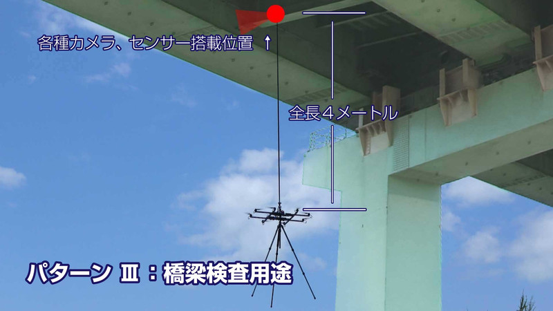 橋梁検査用途では、プロペラの上空4mに各種カメラ、センターを設置。橋梁付近の乱流などの影響で従来のドローンでは近づけなかった距離まで接近できる他、狭い隙間への侵入が可能になる。