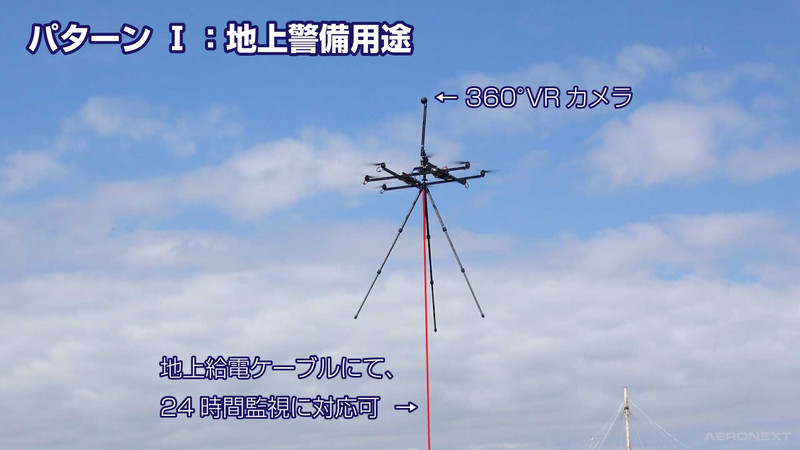 地上警備用途では、プロペラ上部、1mの位置に360°VRカメラを設置。 地上給電ケーブルを取り付けることで、360°VRカメラによる高画質で安定した24時間監視が可能になる。