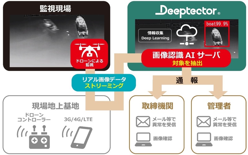 両社は、ドローンで撮影・収集した漁業密漁監視の映像を画像認識 AI 「Deeptector」で解析する実証実験を2018 年 1 月より進めた結果、密漁の監視抑止に大きな効果が期待できることを確認した。