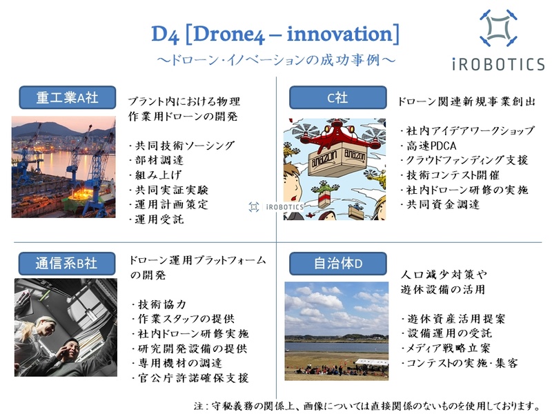 アイ・ロボティクスはドローンによる産業構造の刷新「ドローン・イノベーション」をより身近にするため、「Drone 4 - innovation」のプログラム(通称「D4」)の提供を開始する。