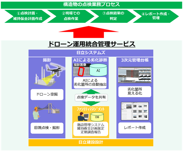 日立システムズは、「自動劣化診断機能」の点検対象物として、まずはビルなどの建築物向けに提供を開始する。今後は橋梁やトンネル・プラントなどに提供範囲を広げていく予定だ。今後もドローン関連ビジネスを更に強化し、「ドローン運用統合管理サービス」を拡販することで2020年までに200社以上の導入を目指している。