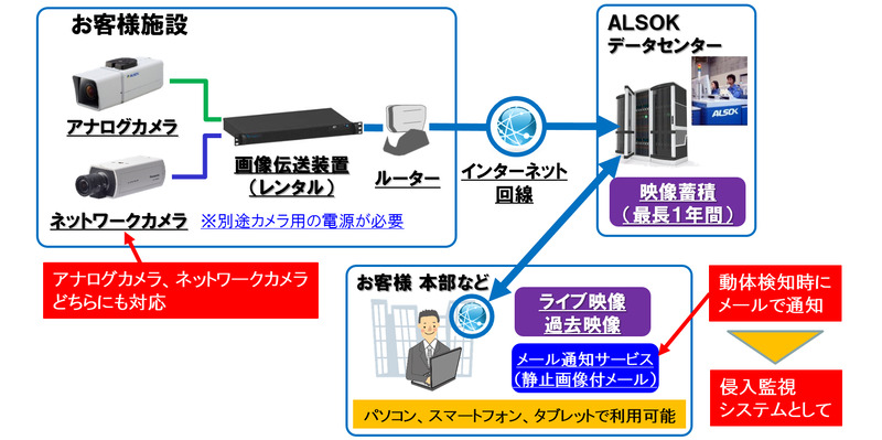 2018 年 5 月 7 日、ALSOKと ALSOK 福島は、警備・災害監視用ドローンに有線で電源供給と映像伝送を行うことで、長時間・高画質な上空からの監視を実現した「有線ドローンによる広域監視システム」を開発したと発表した。