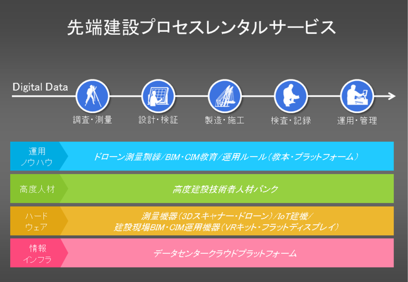 「先端建設プロセスレンタルサービス」は 4つのレイアで構成される。第1レイアは「情報インフラ」として i-Constructionデータストレージ、BIM/CIMマネジメントプラットフォーム。第2レイアは「ハードウェア」として測量機器/IOT建機/建設現場 BIM・CIM運用機器。第 3レイアが「高度人材」で高度建設人材技術者バンク。第 4 レイアが「運用ノウハウ」としてドローン測量訓練、BIM/CIM 教育、運用ルールの整備となっている。