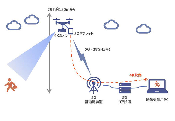 2018年6月8日、KDDI株式会社は、国立大学法人東京大学 中尾研究室、トライポッドワークス株式会社、株式会社プロドローンと共同で、次世代移動通信システム「5G」を用いたドローンからの4K映像伝送実験に国内で初めて成功したと発表した。