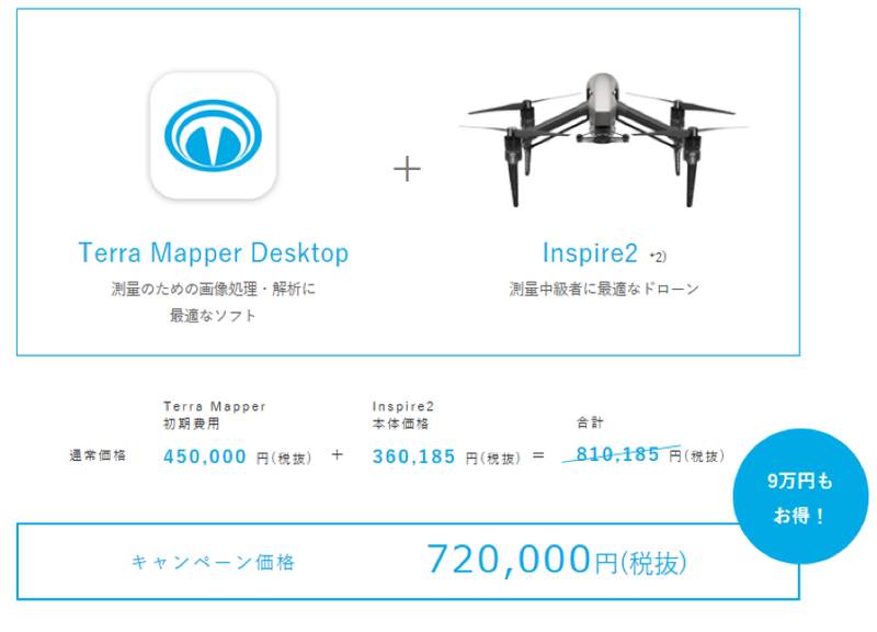 このキャンペーンでは、2018年7月31日までにTerra Mapper デスクトップ版」と「Inspire2」をセットで購入した場合に、通常価格より9万円お得な720,000円(税別)で提供する。