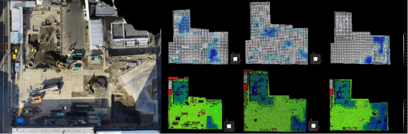 竹中工務店は、掘削土量・杭芯精度管理等の建築工事現場の管理業務の効率化を目的に、積極的にドローンと高精度カメラによる3次元計測技術等新技術の導入、及びそれらの成果物による施工管理を実施している。