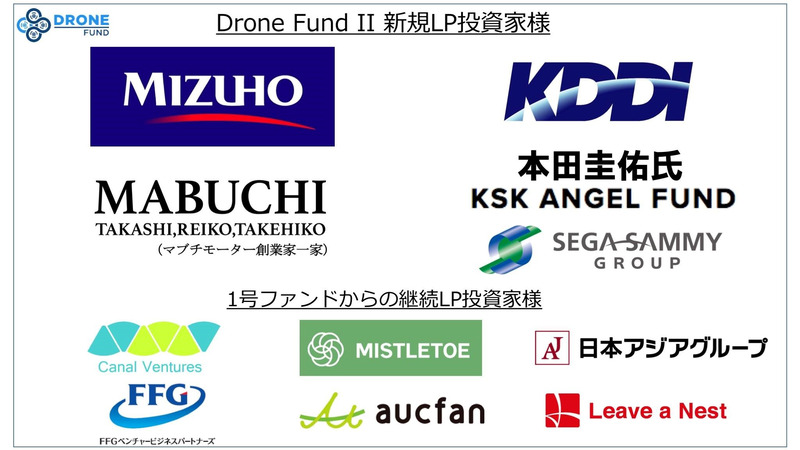 2018年7月31日、日本を代表する個人投資家である千葉功太郎氏が率いるDrone Fundは、ドローン・スタートアップ特化型ファンド「Drone Fund2号」(正式名称:千葉道場ドローン部2号投資事業有限責任組合)の設立を発表した。ファンドサイズは最大50億円となり、世界最大級の規模になる見込みだ。新規の初期投資家として、サッカー日本代表 本田圭佑氏(個人投資用のKSKエンジェルファンド)や、国内大手企業などが参画を表明した。