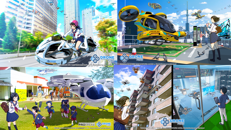 Drone Fund2号の設立に合わせ、Drone Fundが目指す、「ドローン前提社会」や「エアモビリティ社会」の近未来予想図をイラストで発表された(下図)。イラストは、「ドローン観光」や「ドローンタクシー」、「公道を走るホバーバイク」など、ドローンが生活で活用されている場面が描かれる。