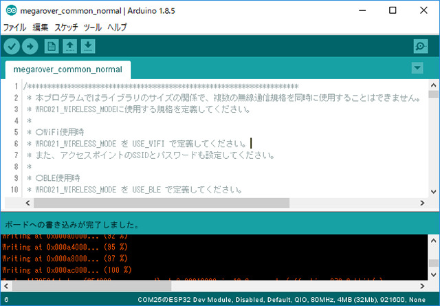メカナムローバーVer2.0の制御ボードである「VS-WRC021」には、ESP-WROOM-32 マイコンが搭載されている。そのため、Arduino IDEを用いて制御プログラムを作成することが可能である。また、製品付属のライブラリにはモータ制御関数や通信関数が含まれていまため、少ない開発負担で制御プログラムを作成することもできる。