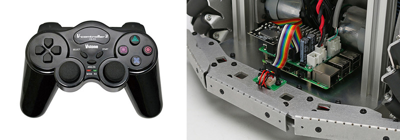 Wi-Fiまたは、USBシリアル通信を用いてROS環境に接続できる。ROSのメッセージ通信に対応しているため、速度や旋回量の指令値を、わずか数行のコードでメカナムローバーに送信することができる。導入ドキュメントとサンプルプログラムが付属しており、初心者でも、ROS環境で制御システムを作成し、簡単に動かすことができる。