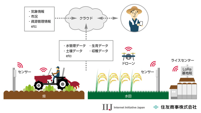 IIJと住友商事は、同提携を通じて、水稲・小麦・大豆・サトウキビ等を対象に、農作業の効率化やノウハウの可視化を実現するため、製品開発や製造販売に関する取組を推進する。まずは、農業生産者にとって使い易く安価な通信サービスの事業化に向け、住友商事が戦略的提携を発表(※1)したJAみやぎ登米管内において、LoRaWAN 等のLPWA(※2)技術と各種センサーを用いた通信技術の実証を進める予定である。