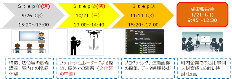 「川俣町ドローンスクール」は川俣町で新産業創出に向けて、自治体、企業、高校の連携を強化し(産官学連携)、新産業へ対応できる人材育成に取り組み、地元での事業に活用できることを目指して実施されている。第2回目講座となる10月21日(日)の回では、川俣高等学校公開文化祭と同時開催をした。