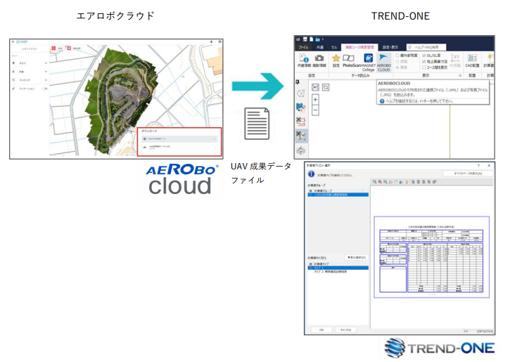 今回、エアロセンスと福井コンピュータは、エアロボクラウドで作成されたUAV成果データ(3次元点群解析情報)をTREND-ONEに取り込める機能を実現した。これにより、エアロボクラウドで生成されたUAV成果データをTREND-ONEにて解析、管理し、i-Construction で求められる種々の帳票を出力することが可能となる。以前より行っていたエアロボクラウドとTREND-POINTとの圧縮点群によるシームレスで高速な連携と相まって、i-Constructionで定義される一連のデータ生成、解析プロセスが、両社製品連携でより一層容易になり、測量業務の大幅な効率化を実現する。
