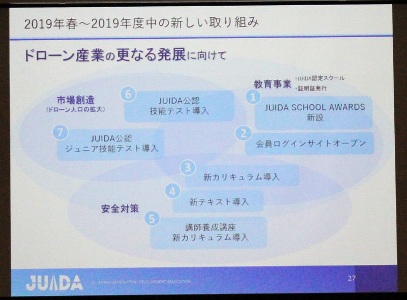 ドローンの市場拡大のためには新規プレイヤー参入が必要であり、安全な運航のためには環境整備やルール作りが重要である。特に市場創造に力を入れており、ジュニアライセンスの導入や会員ログインサイトオープンが発表された。なお、詳細については後日発表される。