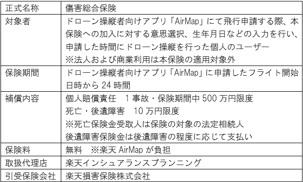 注1 「AirMap無償付帯賠償責任保険」は、保険契約者を楽天AirMap、被保険者を「AirMap」を利用する個人のユーザー(保険付帯希望者)とする「傷害総合保険」のペットネーム。保険料は保険契約者である 楽天AirMapが負担する。