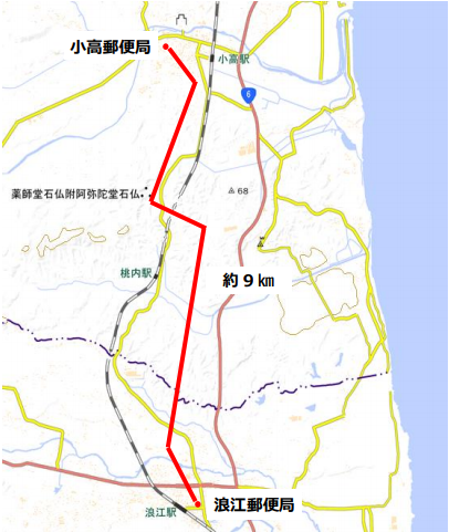 運航開始日は同年11月7日(水)で、飛行区間は小高郵便局(福島県南相馬市)~浪江郵便局(福島県双葉郡浪江町)間。9:00~16:00 の間に1日最大2往復を予定している。積載するものは2kg以内の荷物等とし、飛行高度と速度は地面から60m以下の高さを15m/s(約54km/h)以下の速度で飛行する。