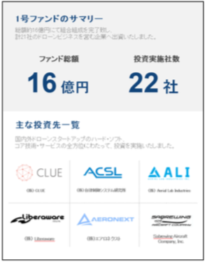 2017年6月に始動した、国内初のドローン・スタートアップ特化型ファンド「 Drone Fund1号ファンド 」は、ドローン市場への注目も相まって、発表後、大きな反響を得た。このDrone Fund1号ファンドは、2018年1月にファ ンド総額約16億円にて資金調達を完了しており、同年10月現在で、22社のドローン関連のスタートアップに投資を実行している。