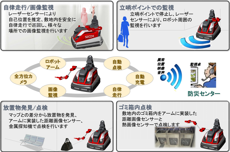 今回の実証実験において「セコムロボットX2」は、巡回監視ルートを正確に自律で走行する。 搭載されたアームには‘距離画像センサー’‘熱画像センサー’‘金属探知機’が内蔵されており、 不審な放置物やゴミ箱内を点検。また、巡回後は定められた立哨ポイントで停止し、 周囲の監視を行う。