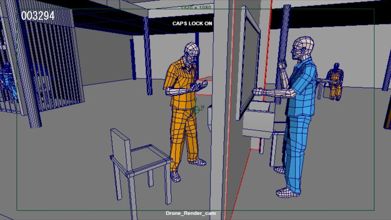 撮影現場となる14m x 14mのスタジオセット内には、モーションキャプチャーシステム「OptiTrack」を張り巡らせ、ドローンの座標をフレーム毎に認識してトラッキングし、アニメーションの座標に追尾させるよう実装させた。
