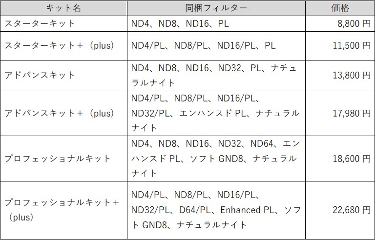 基本のND(4、8、16)とPLをセットにしたスターターキット、それにナチュラルナイトとND32を追加したアドバンスキット、さらに ND64、エンハンスド PL、ソフトグラデー