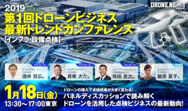 第1回のテーマは、ドローンビジネスのなかでも特に期待が高まっている“点検業務”となっている。カンファレンスの前半では、2019年の新たな年を迎え、登壇各社の事業活動をそれぞれが説明する。カンファレンス後半は、ハード事業、人材育成(スクール)事業、サービス事業、それぞれの分野をけん引する3社がパネルディスカッション形式でトークを繰り広げる。