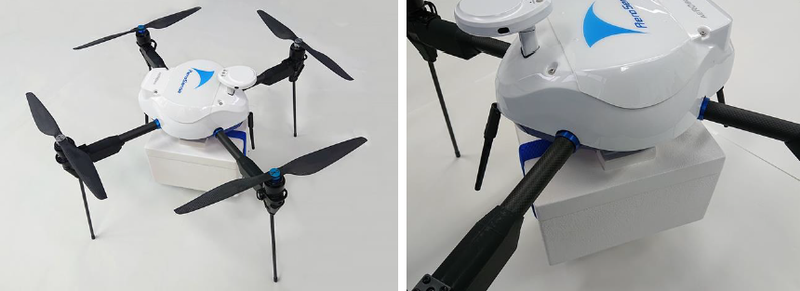 同機のために開発した搬送ボックスは、軽量かつ断熱性に優れる基材に特殊コーティング処理を付与することで強度と耐候性を確保している。環境変化に対してデリケートな医療資材や生鮮食品などの品質を維持し安全に届けるための輸送パッケージとして提供可能である。同機では搬送物重量2kgまでを想定している。