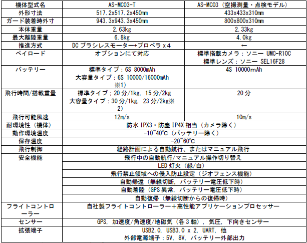 既発売AS-MC03は、空撮測量・点検用に特化し小型サイズと軽量化を徹底的に追求したモデルである。