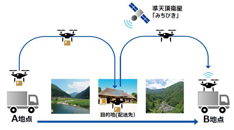 第2回(2月18日実施)第3回(3月5日実施)の実験では、みちびきのセンチメータ級測位補強サービス(CLAS)の高精度な位置補正技術を活用し、トラックの荷台から離陸して目的地へ着陸、目的地で積み荷をおろしたあと、先に進んでいるトラックの荷台に着陸する飛行実験を実施をした。