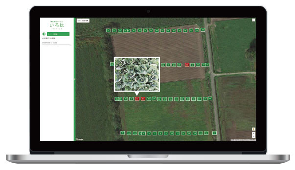 葉色解析クラウドサービス「いろは」は、葉色画像の診断・管理をインターネットを通じて簡単に行うことができるサービスである。ドローンにより撮影された画像は「いろは」にアップロードされることで、圃場内の位置に合わせて自動的に配置、記録される。また、クラウドサービス上に用意された生育診断機能を利用することで作物の生育状況や病気や害虫、雑草といった農地の状況などを画像毎に記録することができる。毎日の葉色の確認を容易にし、きめ細かな生育管理を実現する。
