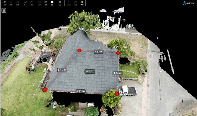 撮影した画像から3次元化を行い、画面上で、面積計算ならびにヤナイソフトウエアー※1 瓦PRO2000に連携する機能を搭載。