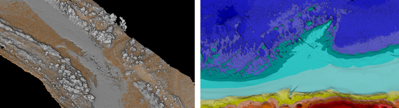 グリーンレーザースキャナでの計測例 (左)河川3次元鳥瞰図、 (右)海岸線標高断彩図