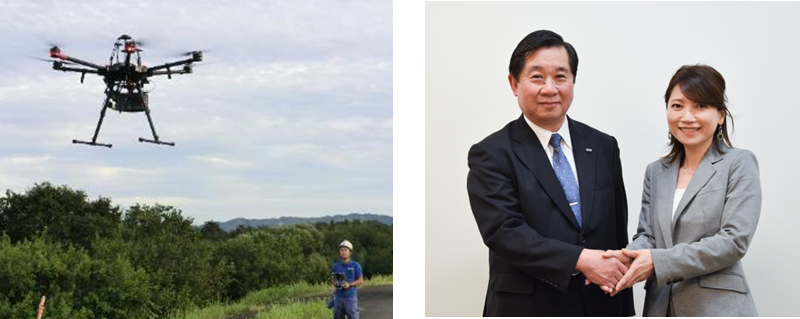 画像左:ドローンに搭載したグリーンレーザースキャナ/画像右:販売代理店契約を締結した両社長(左:パスコ 代表取締役社長 島村秀樹氏、 右:アミューズワンセルフ 代表取締役 佐野ひかる氏)