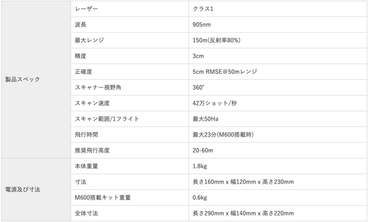・毎秒420,000ポイントのデータ取得し、秒速10mの単一フライトで、距離精度5cm以内・最大50haのスキャンが可能。