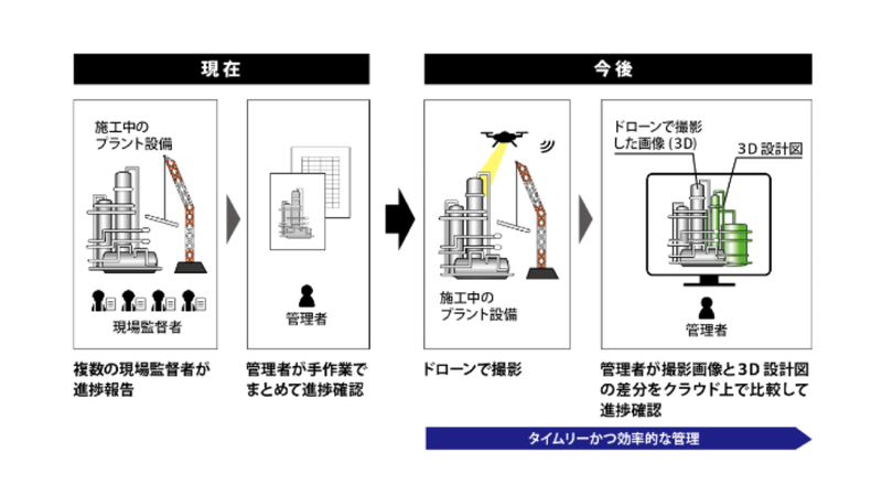 同取り組みでは、施工中の建設現場をドローンで撮影し、構造物を3D上で再現する。続いて、再現した構造物の3D画像とプラントの3D設計図をクラウド上で比較し、その差分を確認することで工事の進捗状況を管理する。
