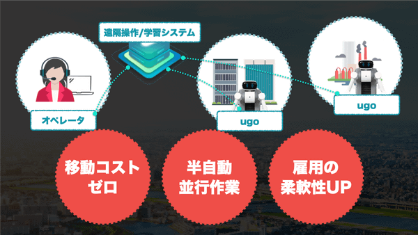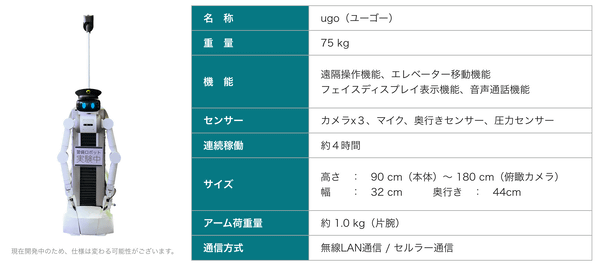 “ugo”は、直感的な遠隔操作とAI技術を用いた自動モードを併せ持つ、次世代型アバターロボットとして誕生した。ビルにおける警備ロボットとして期待でき、“ugo”をオフィスビルに配置することで、警備員の有効的な配置や移動時間の削減による効率化のほか、人材不足の解消にもつながるものと考えているという。