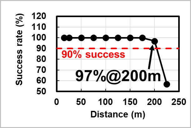 同社は本技術を、市販のレンズを用いたシステム構成において実装し(図4)、高解像度を保ったまま、ソリッドステート式において従来比4倍となる200mの長距離測定性能を達成した(図5)。