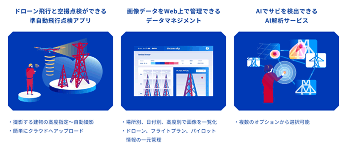 新たに提供開始するのは、高層建造物等の静止画を高度や方角ごとに整列させて表示する「バーティカルビューワー」、撮影動画を管理・確認することが可能な「動画ビューワー」、ドローンの操縦者がタブレット端末からの簡易な操作でドローンをコントロールできる「鉄塔点検アプリ(高層建造物点検用)(※2)」、撮影映像を多拠点へ同時中継できる「ライブ配信アプリ(※2)」の、4つの機能である。さらに、鉄塔の保守作業向けのオプション機能として、ドローンで撮影した鉄塔の画像からAIを活用して自動でサビを検知する「AIサビ検知」も新たに提供する。