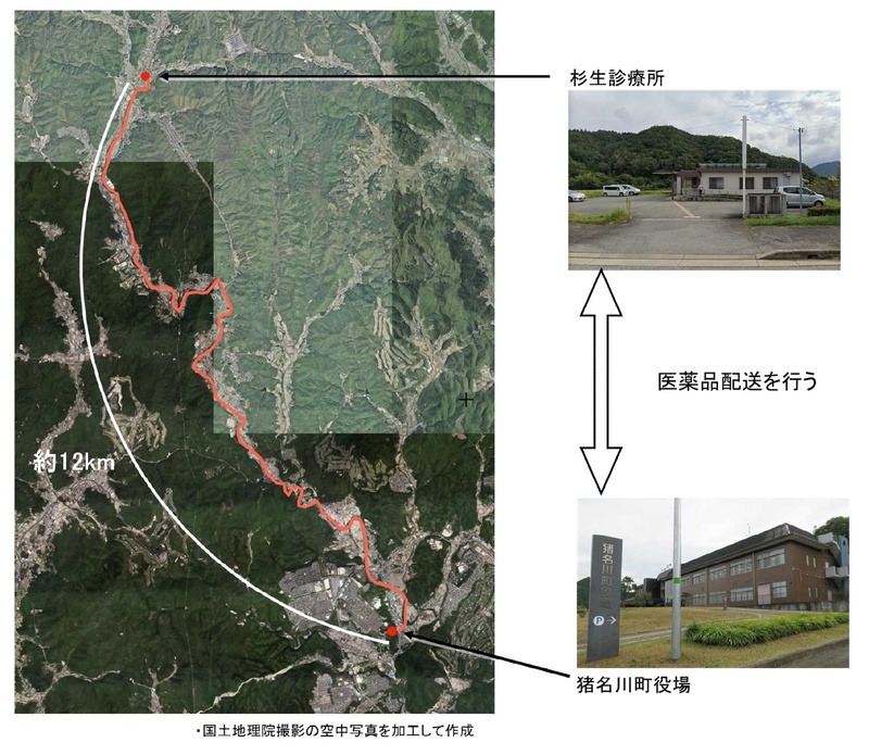 兵庫県地域創生戦略の地域プロジェクトの一つである「多自然地域一日生活圏維持プロジェクト」の一環として、ドローンにより南部の町役場から北部の杉生診療所へ医薬品を運ぶ。