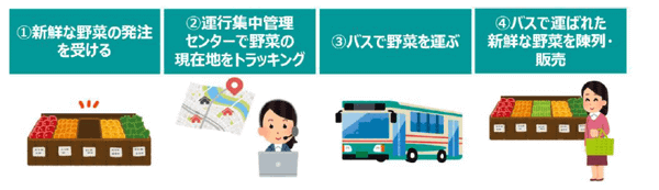 平常時のシナリオでは、新鮮な野菜の配送・販売実証として、買い物弱者を支援する物資配送の仕組みの構築を目指し、市街地などで販売する新鮮な野菜を地域住民が地元で購入できるような貨客混載による配送の有用性を検証した。(実施日:2021年11月5日、12日、19日、26日)