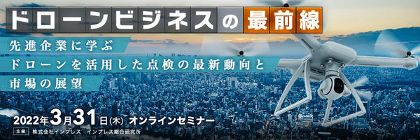 インプレス総合研究所は、オンラインセミナー「ドローンビジネスの最前線 先進企業に学ぶドローンを活用した点検の最新動向と市場の展望」を、2022年3月31日(木)に開催する。各分野のトップリーダーを招いて最新のドローン市場の動向を解説し、今後の展望を示す。