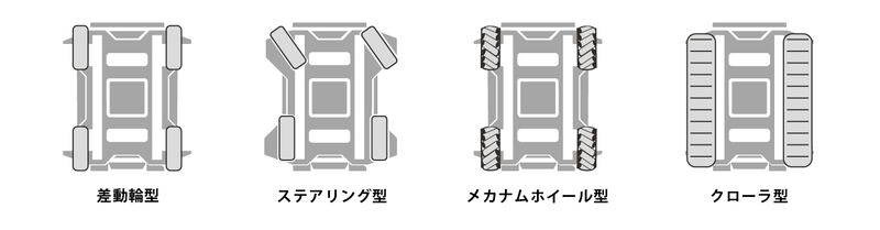 「差動輪型」「アッカーマン型フロントステアリング」「クローラ型」「メカナムホイール型」の4つの車両タイプに容易に可変でき、様々な車両タイプや環境を想定した走行実験が可能。