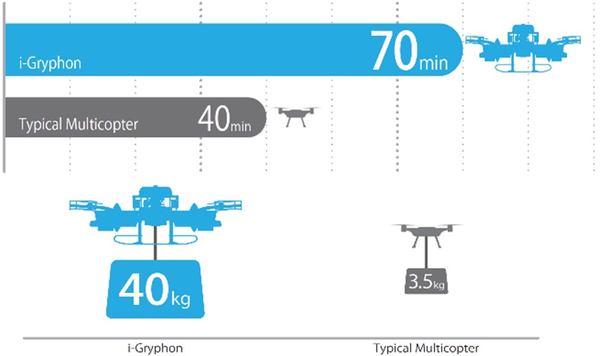 2022年7月14日、IHIエアロスペースは、重量物の運搬と長時間飛行を両立する、エンジンと電気モーターによるマルチコプター型ハイブリッドドローン「i-Gryphon」を開発したことを発表した。